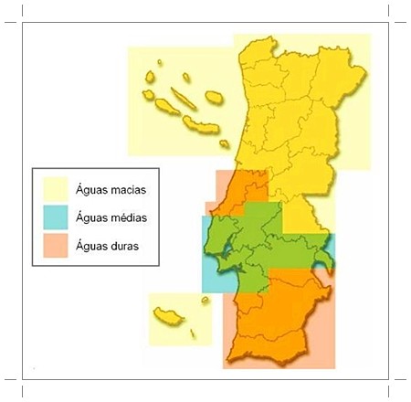 Tanto para ter uma ideia, eis o mapa da dureza da água em Portugal (não encontrei um mapa deste tipo para o Brasil):