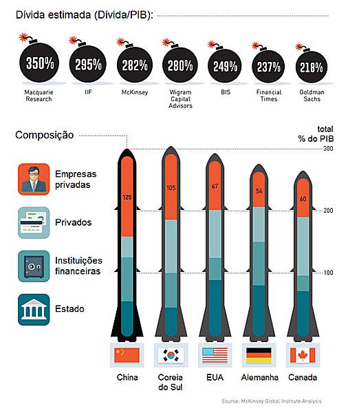 As empresas de consultoria Mckinsey e Macquaire avaliam o total da Dívida respectivamente em 282% e 350% do Produto Interno Bruto (PIB), enquanto a infame Goldman Sachs fala de 216% (ou 270% segundo as últimas estimativas). Mas ninguém consegue fornecer valores seguros: só sabemos que a Dívida chinesa existe e que não é nada pequena.