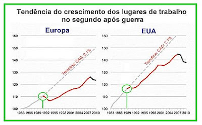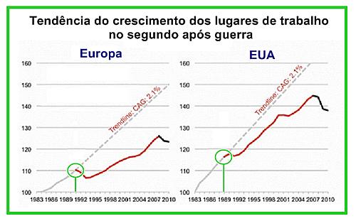 - Observa, à direita: desde o começo da globalização, na década dos anos '90, o crescimento dos lugares de trabalho, que antes era de 2.1% anual, caiu vertiginosamente.