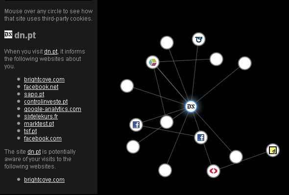 Para ter uma ideia do que se passa ao abrir uma página internet, podemos utilizar uma extensão para Firefox e Chrome, cujo nome é Collusion (aqui a versão Firefox, aqui a versão Chrome): este plugin mostra para quais sites são enviadas as nossas informações a partir duma determinada página internet.