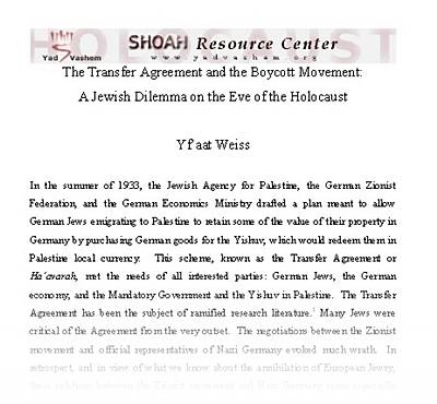 É este anti-semitismo? Não. E não apenas porque é facto historicamente provado, mas também porque está escrito, preto no branco, em The Transfer Agreement and the Boycott Movement: A Jewish Dilemma on the Eve of the Holocaust, no Centro de Estudos Yad Vashem, Vol. XXVI, Jerusalem 1998, pp 129-172. O Centro Yad Vashem, tanto para ter uma ideia, é o memorial oficial de israel para lembrar as vítimas judaicas do Holocausto. O The Transfer Agreement... é um dos mais conceituados documentos sobre o tema do acordo de "transferência" (limpeza étnica) dos judeus europeus que deveria ter sido implementado pelos Nazistas com a entusiasta cooperação dos judeus sionistas da Palestina.
