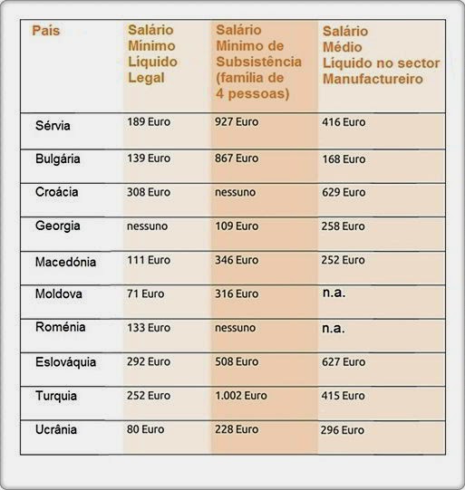 Fontes: Clean Clothes Campaign, Abiti Puliti, Stitched Up: Salários de Pobreza para os trabalhadores do vestuário na Europa Oriental e na Turquia (ficheiro Pdf, italiano)