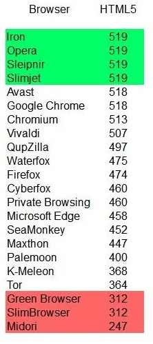 Iron (um derivado de Chrome), Opera, Sleipnir e o surpreendente Slimjet têm trabalhado bem, assim como Avant e Chrome. Os navegadores com o motor de Firefox (Gecko) parecem ter mais dificuldades em actualizar-se. Negativo o resultado de Edge que, todavia, é um produto em plena fase de desenvolvimento. Muito mal Green Browser, Slim Browser e Midori que, não acaso, utilizam motores de velha concepção.