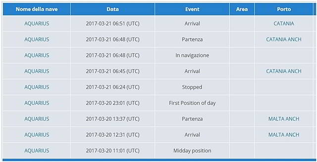 No gráfico abaixo é possível observar a rota do navio Aquarius no passado dia 21 de Março, tendo este partido das costas da Líbia e tendo mais tarde chegado ao porto de Catania (Sicilia, Italia) após uma paragem na ilha de Malta: