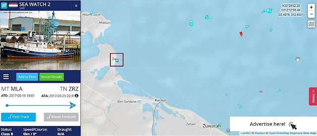 - Astral: é da organização Proactiva Open Arms. Segundo o site da Gefira se encontra nas águas líbias mas desaparece com base regular dos sites de rastreamento AIS (Automatic Identification System, sistema de monitorização utilizado em navios).