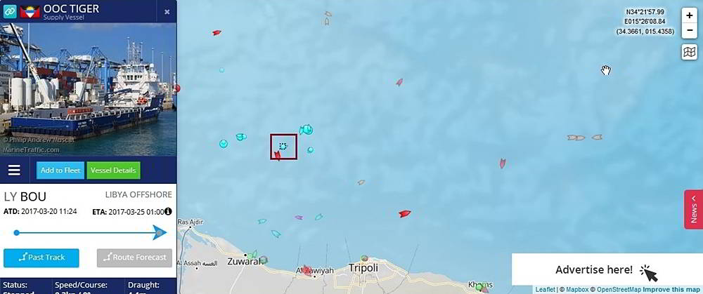 No gráfico abaixo é possível observar a rota do navio Aquarius no passado dia 21 de Março, tendo este partido das costas da Líbia e tendo mais tarde chegado ao porto de Catania (Sicilia, Italia) após uma paragem na ilha de Malta: