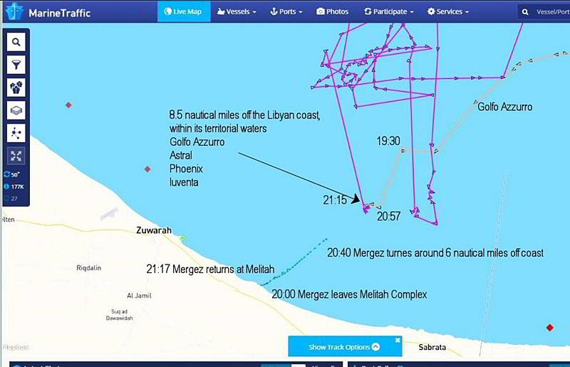 De acordo com os dados, o navio partiu de manhã cedo em direção da Líbia, várias horas antes de ser lançado um SOS por parte dos barcos dos migrantes. Só perto das 19 horas o centro de coordenação marítima de Roma sinalizou ao Golfo Azzurro e a outros três navios "humanitários" que havia um SOS dum barco carregado com migrantes. Perto das 21 horas começou a operação de resgate de 113 pessoas, com 17 desaparecidos. 12 horas no meio do mar à espera dum SOS?