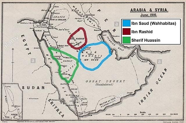 Os britânicos começaram a preocupar-se acerca duma possível aliança entre Ibn Rashid, que controlava a parte norte da península, e o Sharif que controlava a parte ocidental. Além disso, o Império queria que as rotas terrestres entre os portos palestinianos do Mar Mediterrâneo e do Golfo Pérsico ficassem sob o seu controle.