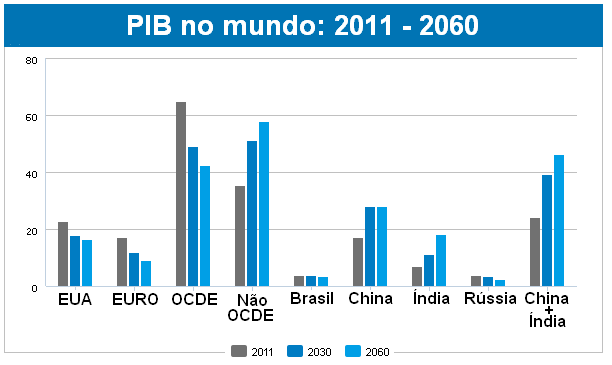 Como podemos ver, os Países da OCDE irão trocar a posição com os não-OCDE: se hoje o valor dos primeiros ultrapassa 60% do PIB mundial, daqui a 30 anos as coisas já terão mudado muito. Interessante os valores da extrema direita, os de China e Índia juntas.