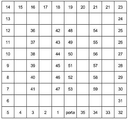 Fiz um pequeno esquema que mostra como é possível, em apenas 100m2, cultivar 59 alimentos se aproveitarmos eficientemente o espaço. Cada quadrado equivale a 1m2 :