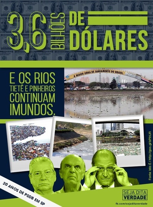 May 28, 2014 14:34 - no comments yetPSDB gastou 3,6 Bilhões de dólares e os principais rios de São Paulo continuam poluídos. #20anosdePSDB #MudaSP pic.twitter.com/QhCeDjvwWy