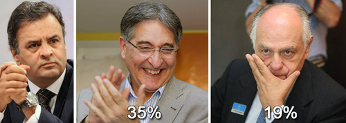 26 de Maio de 2014, 13:32 - sem comentários aindaPesquisa Vox Populi, divulgada nesta segunda-feira, traz resultados surpreendentes; no estado do senador Aécio Neves (PSDB-MG), o petista Fernando Pimentel seria eleito governador no primeiro turno; ele tem 35% das intenções de voto, contra 19% do tucano Pimenta da Veiga; para o PSDB, o que a pesquisa traz de positivo é a simulação para o Senado, onde o ex-governador Antonio Anastasia teria 56% das intenções de votos; na disputa presidencial, Aécio aparece com 22% dos votos, à frente da presidente Dilma Rousseff, com 20%, e do socialista Eduardo Campos, com 2%
