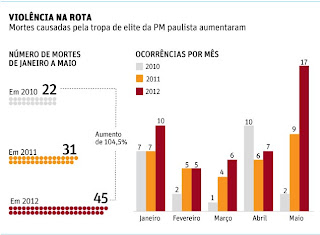 July 4, 2012 21:00 - no comments yet Policiais militares da Rota, espécie de grupo especial da PM de São Paulo, mataram 45% mais neste ano do que entre janeiro e maio de 2011.