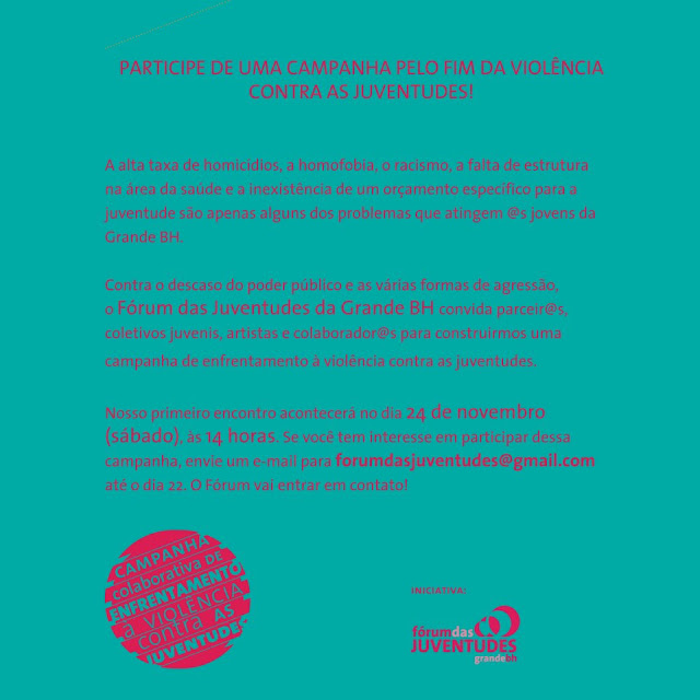 O Fórum das Juventudes da Grande BH produziu um documento com informações que mostram como alguns direitos d@s jovens têm sido sistematicamente violados, especialmente em Belo Horizonte. O documento "Agenda de Enfrentamento à Violência contra as Juventudes" pode ser lido ou impresso em: