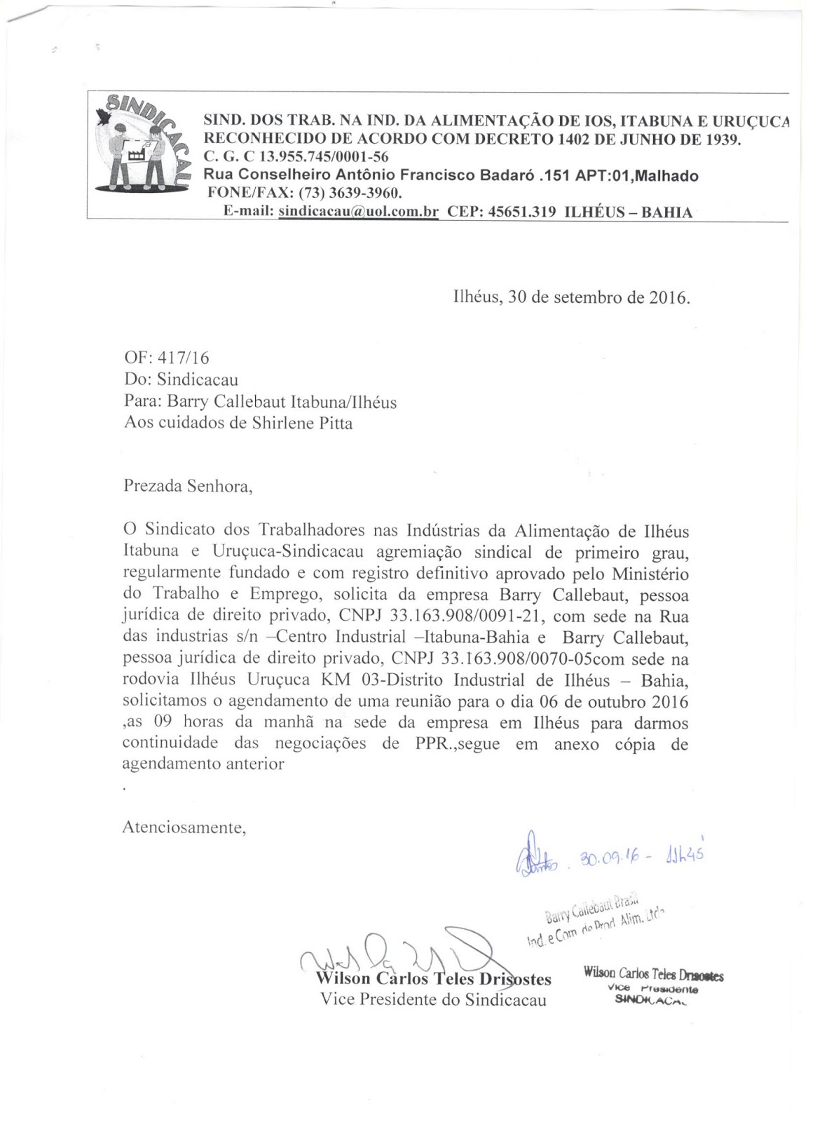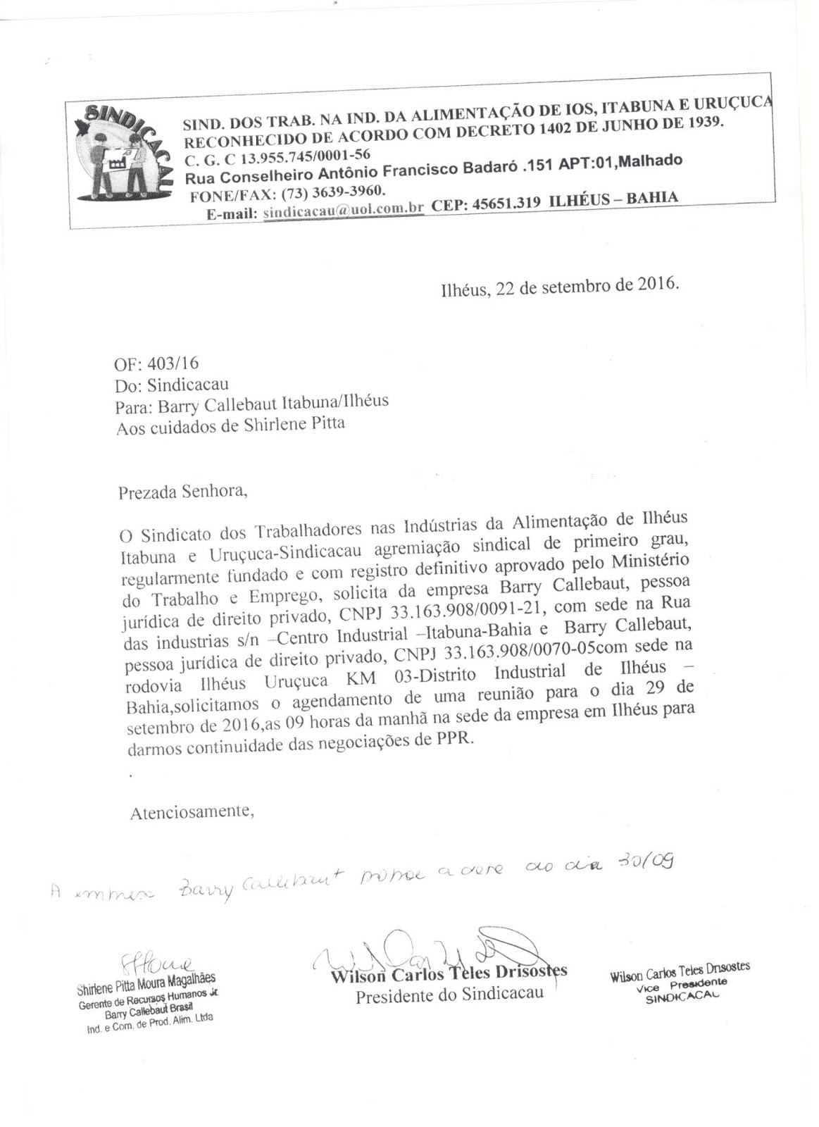 A CARGILL CACAU EM ILHÉUS NA BAHIA INICIOU AS REUNIÕES TRIMESTRAIS,COM OS FUNCIONARIOS ,E SEGUNDO O GERENTE GERAL SR DIEGO NEVES O PAGAMENTO PPR CARGIIL 2014-2015 E 2015-2016 SÓ SERA FEITO APÓS O SINDICATO ASSINAR OS ACORDOS,ACONTECE QUE A ASSEMBLEIA PARA APROVAÇÃO DOS ACORDOS FOI REALIZADA COM OS TRABALHADORES NOS DIA 19 E 20 DE SETEMBRO DE 2016 E O SINDICATO ENVIOU DOIS OFICIO NOS DIAS 22 E 27 DE SETEMBRO DE 2016 QUE SEGUEM ABAIXO,SOLICITANDO DATA PARA ASSINATURA DOS PRESENTES ACORDOS ,ACONTECE QUE É UMA INVERDADE DESTE GERENTE QUE QUER COLOCAR OS TRABALHADORES CONTRA O SINDICATO OU FALTA DE COMUNICAÇÃO DA PARTE DELE COM O SETOR DE RH DA EMPRESA,É LAMENTAVEL TAL ATITUDE QUE DEMOSNTRA ESPIRITO RANCOROSO OU FALTA DE COMPETENCIA PARA A FUNÇÃO.