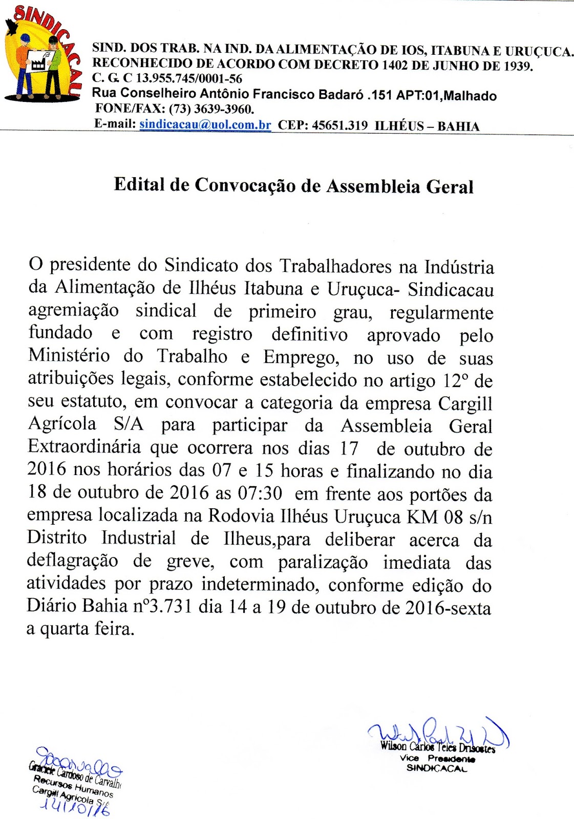 CARGILL CACAU EM ILHÉUS CONFIRMA INICIO DAS NEGOCIAÇÕES DE PPR 2016-2017 COM O SINDICACAU