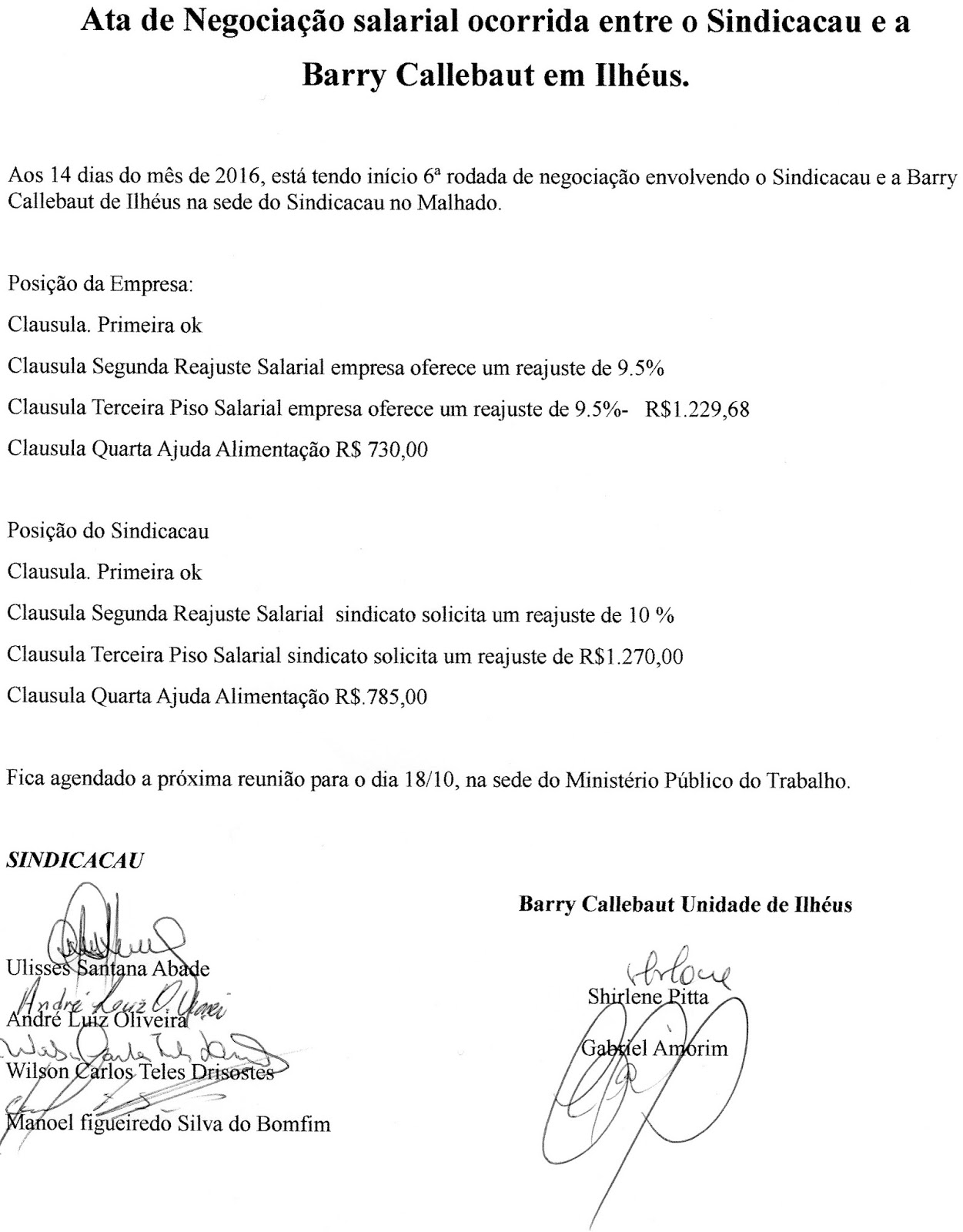 6ª RODADA DE NEGOCIAÇAO ENVOLVENDO SINDICACAU E BARRY CALLEBAUT ILHEUS DIA 14-10-2016