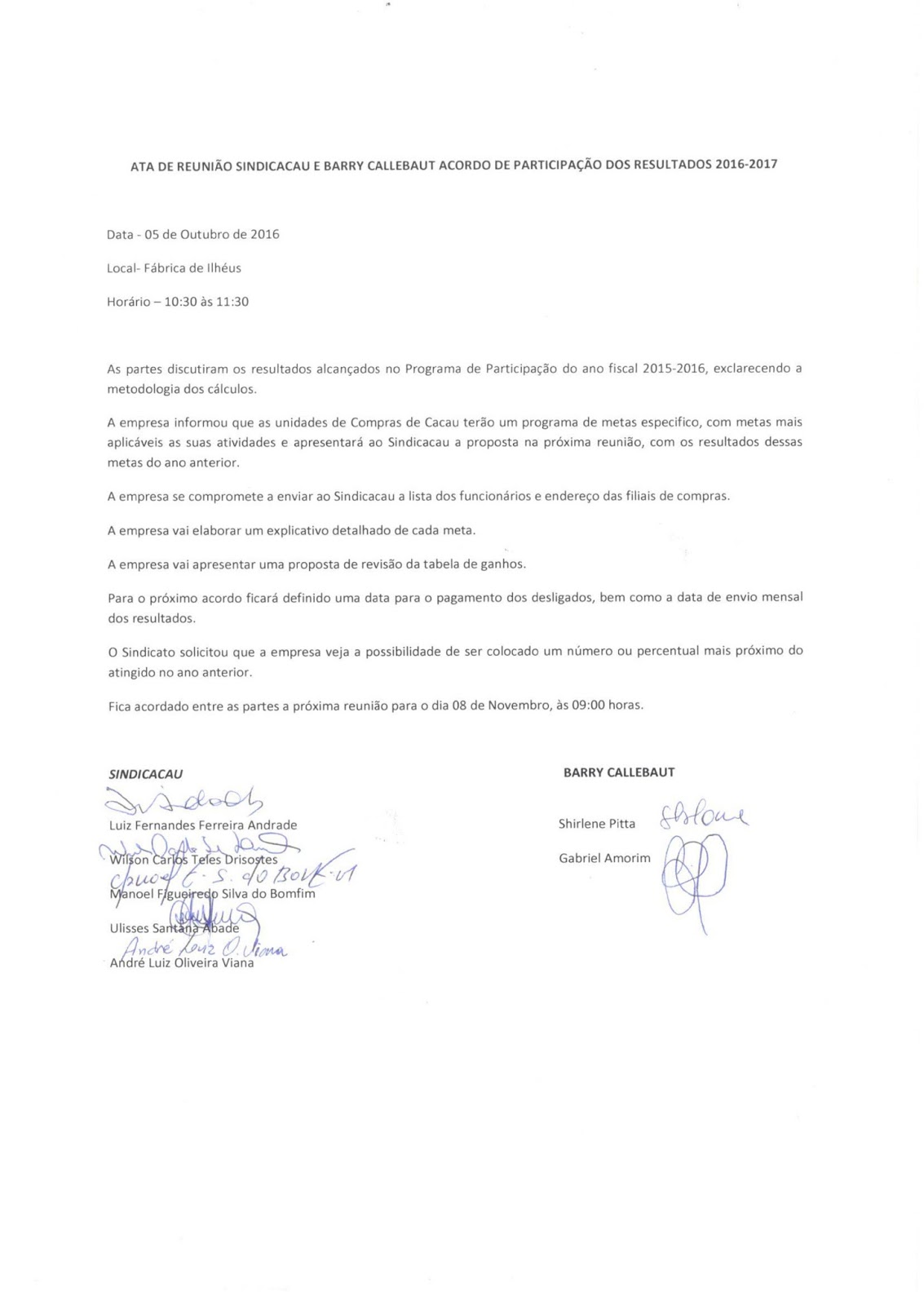O Sindicacau realizou Assembleia Geral hoje pela manhã dia 04 de outubro de 2016, com os trabalhadores da Inaceres Industria de beneficiamento de palmito , instalada em Uruçuca-Ba do grupo Agroceres, os trabalhadores aprovaram a pauta de reivindicações, a pauta ainda não foi entregue a empresa.