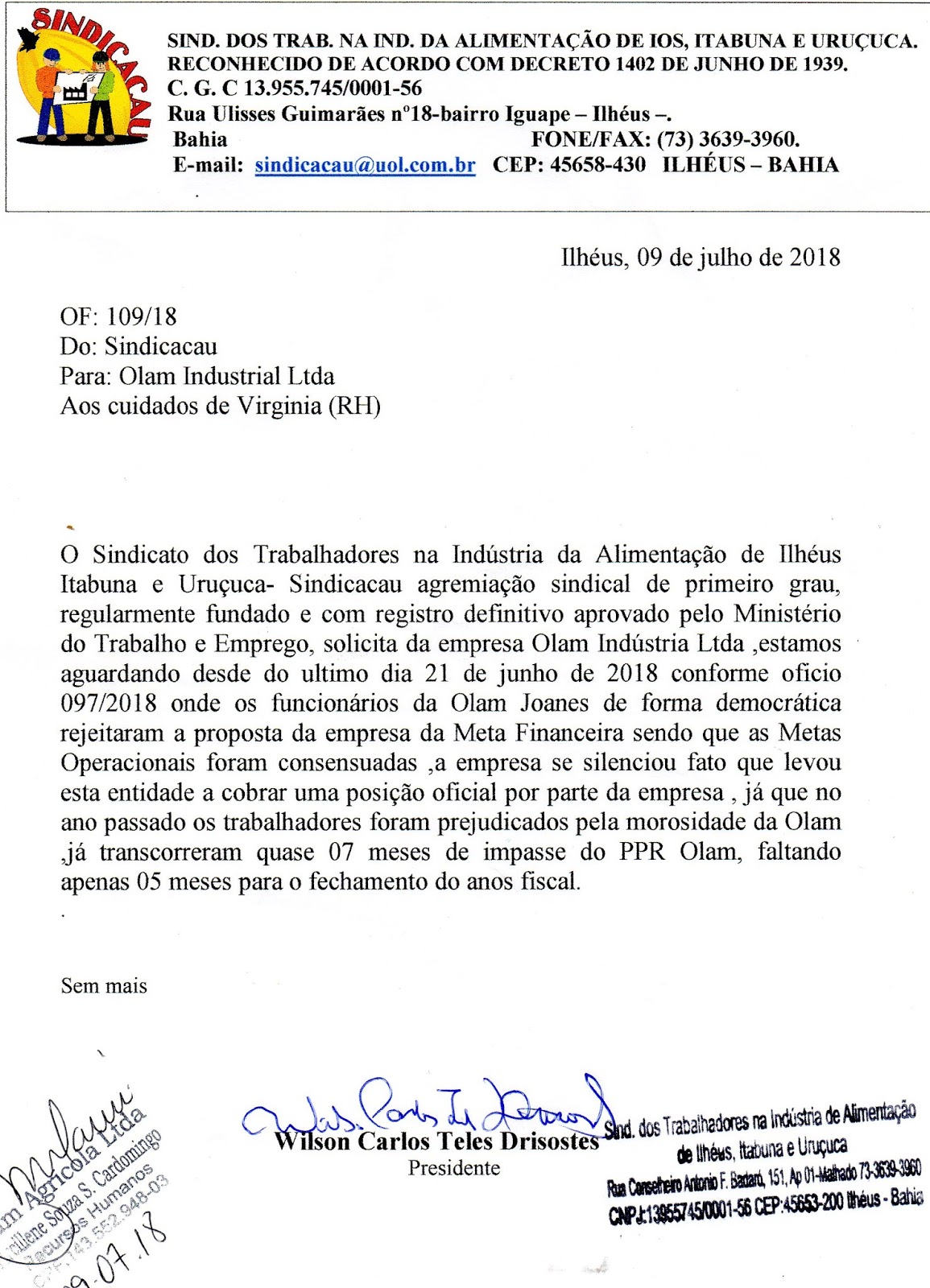 julio 9, 2018 14:00O SINDICACAU VEM NEGOCIANDO COM A OLAM JOANES EMPRESA MOAGEIRA DE CACAU LOCALIZADA NA RODOVIA ILHÉUS URUÇUCA KM 04 O ACORDO DE PPR 2018,A PROPOSTA DA EMPRESA DE META FINANCEIRA FOI REJEITADA PELOS TRABALHADORES SEGUE ABAIXO OFICIO ENVIADO A EMPRESA HOJE.