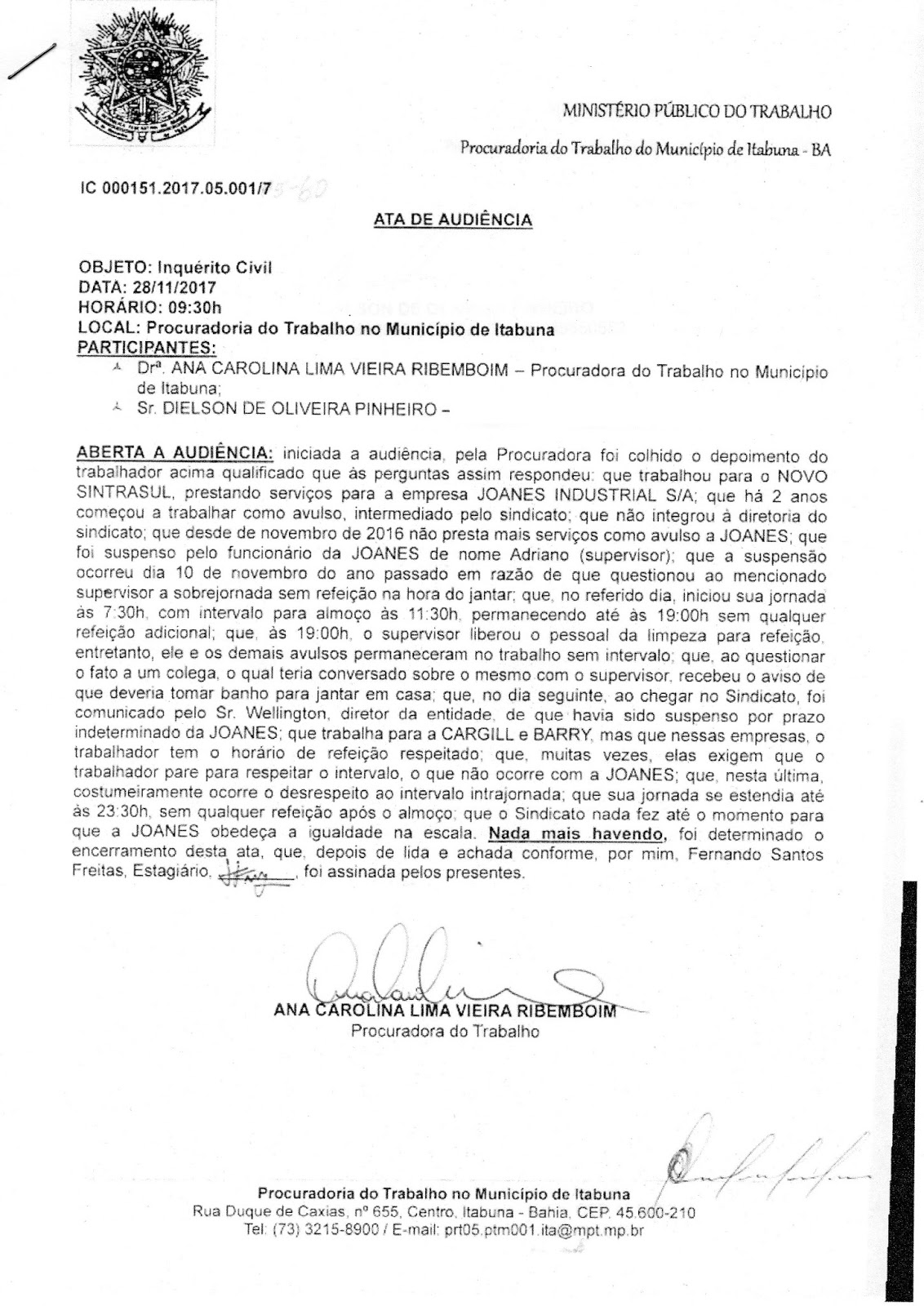 MINISTERIO PUBLICO DO TRABALHO EM ITABUNA :ATA DE AUDIENCIA