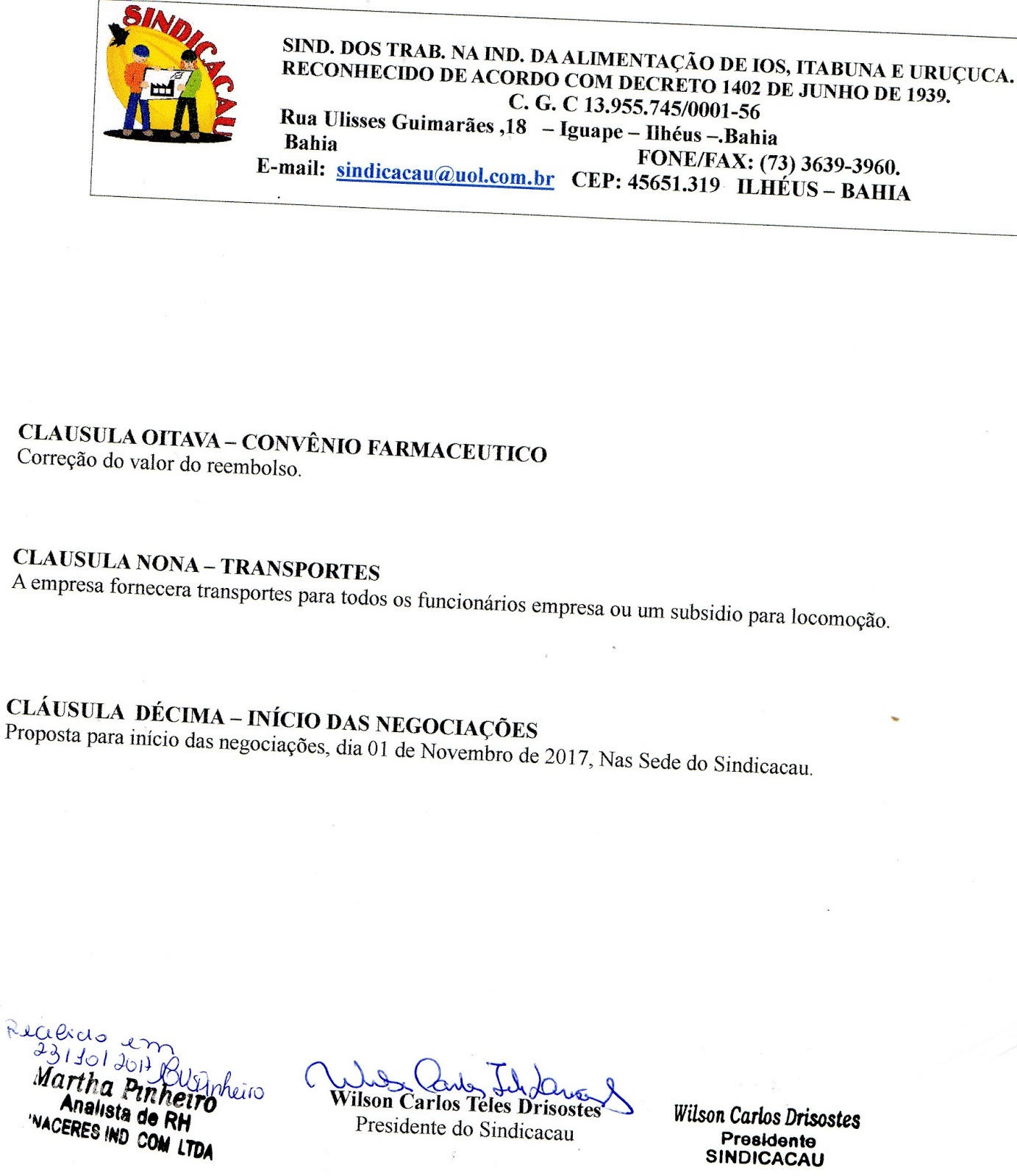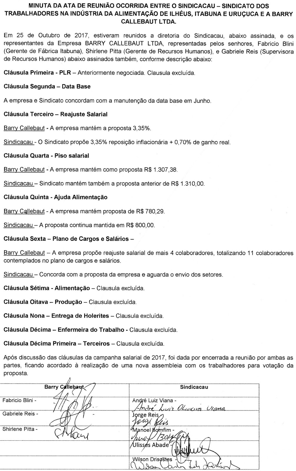 Aos dez dias do mês de outubro de 2017, nas Instalações do Sesi, unidade Ilheus, estiveram reunidos a diretoria do Sindicacau, abaixo assinada, e os representantes abaixo da Olam Agrícola Ltda, para a quinta rodada de negociação do Acordo Coletivo de Trabalho com vigência até 31 de maio de 2017. A empresa apresentou a seguinte proposta: