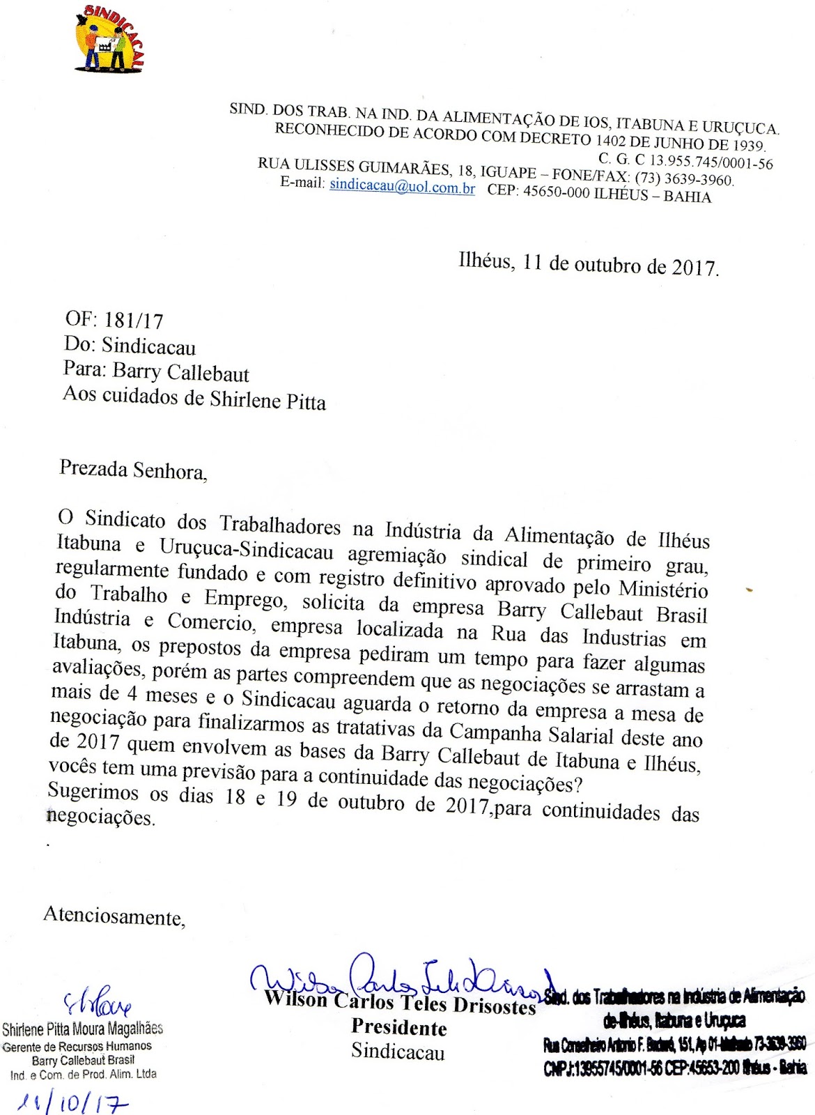 O Sindicacau após a rejeição da proposta em Assembleia realizada com os trabalhadores a pedido da própria Barry Callebaut convidou a empresa a retornar a mesa de negociação através de ofícios enviados a empresa nos dias 11 e 18 de outubro de 2017,entendemos que a mesa de negociação é o melhor local para inicio meio e fim de toda Campanha Salarial,portanto tanto o Sindicato quanto os trabalhadores aguardam que com maturidade a empresa venha para finalizarmos as negociações deste ano.