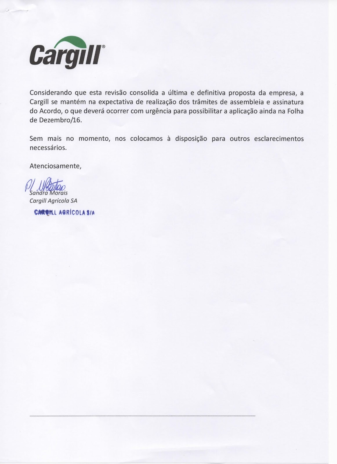 SINDICACAU ANALISA PROPOSTA ENVIADA PELA CARGILL HOJE DIA 24 DE NOVEMBRO DE 2016