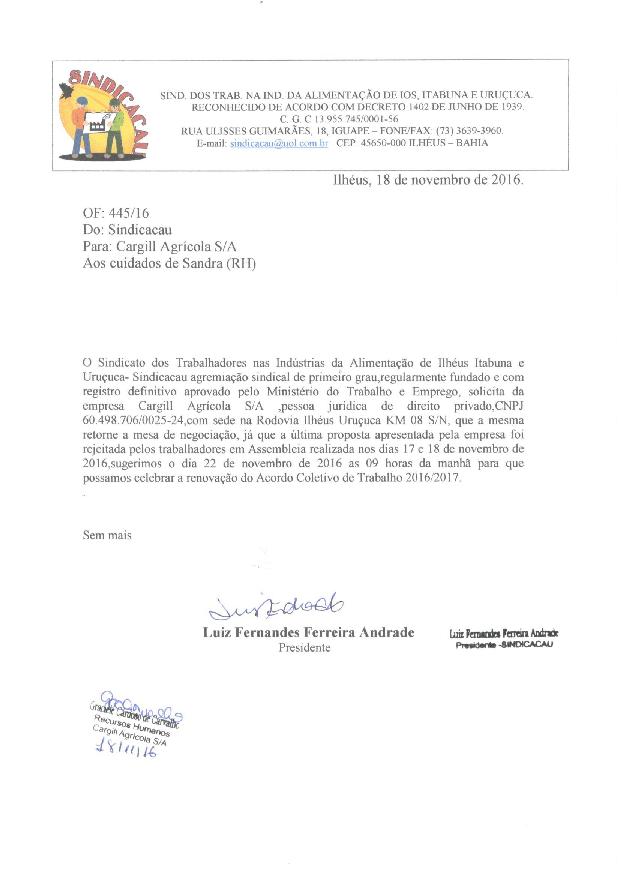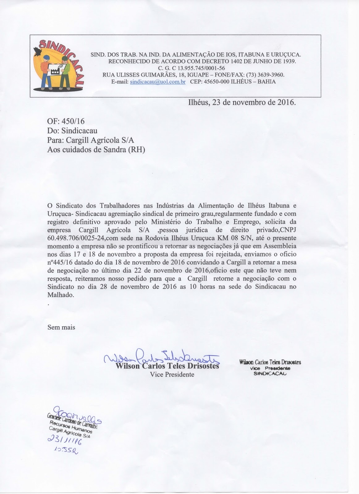 A PEDIDO DA CARGILL AGRICOLA S/A EMPRESA MOAGEIRA DE CACAU FOI FEITA ASSEMBLEIA COM OS TRABALHADORES,PARA AVALIAREM SE APROVAVAM OU NÃO A ULTIMA PROPOSTA APRESENTADA PELA EMPRESA SEGUNDO A PREPOSTA DA EMPRESA CASO OS TRABALHADORES REJEITASSEM A PROPOSTA A EMPRESA RETORNARIA A MESA DE NEGOCIAÇÃO,SÓ QUE NAO FOI O QUE ACONTECEU,O SINDICACAU ENVIOU UM OFICIO NO ULTIMO DIA 18 DE NOVEMBRO DE 2016 SUGERINDO O RETORNO DA EMPRESA NO DIA 22 DE NOVEMBRO DE 2016,OFICIO ESTE QUE A EMPRESA NEM RESPONDEU E ENVIAMOS OUTRO HOJE SUGERINDO A NEGOCIAÇÃO PARA O DIA 28 DE NOVEMBRO DE 2016,ESPERAMOS O BOM SENSO DA CARGILL JÁ QUE A NEGOCIAÇÃO JA SE ARRASTA POR CERCA DE 8 MESES E OS MAIORES PREJUDICADOS SÃO SEUS     300 TRABALHADORES,QUE MERECIAM O MINIMO DE RESPEITO PELA MULTINACIONAL AMERICANA,QUE NÃO QUER REPOR NEM O INPC DO PERIODO.
