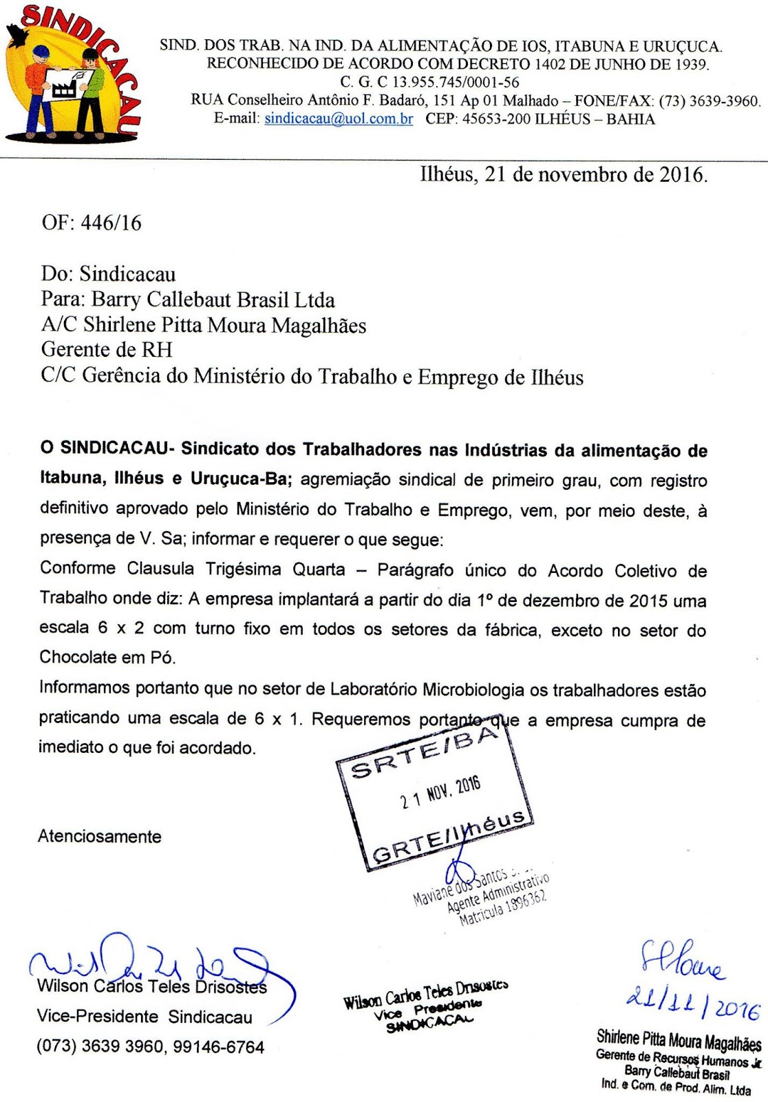 BARRY CALLEBAUT ITABUNA empresa moageira de cacau localizada em Itabuna Bahia, não cumpre cláusula do Acordo Coletivo de Trabalho vigente 2016-2017 e  Sindicacau oficializa a ocorrência e requer o cumprimento imediato, fato que já é de conhecimento do Ministério do Trabalho e Emprego de Ilhéus. E lembra a empresa que a escala de trabalho é 6 x 2 com turno fixo de trabalho em todos os setores da fábrica portanto solicita a imediata regularização.