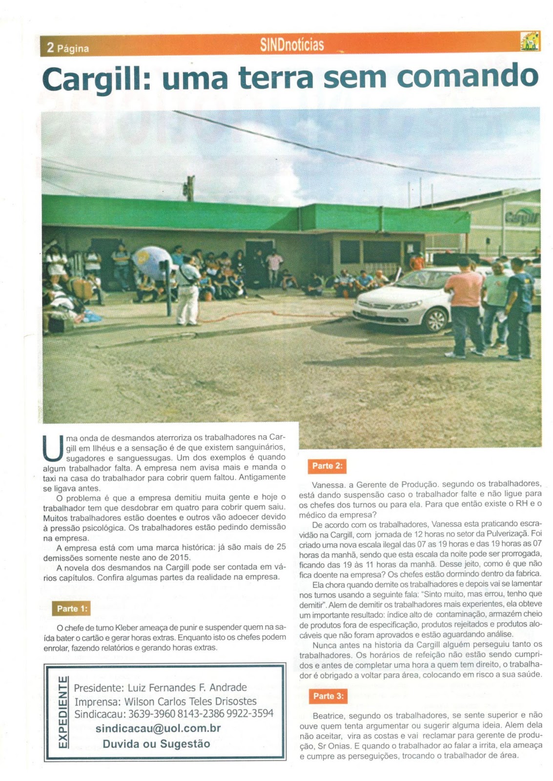 November 24, 2014 12:20A afirmação é do presidente do Sindicato dos Trabalhadores na Indústria de Alimentação de Ilhéus, Itabuna e Região (Sindicacau), Luiz Fernandes Pereira. Nesse domingo, 23, conversamos por telefone com ele sobre o desfecho da campanha salarial dos funcionários da Cargill de Ilhéus. A multinacional tentou descontar os vencimentos dos trabalhadores que paralisaram suas atividades nos dias 07 e 08 de novembro desse ano. Na ocasião, cerca de duzentos e setenta funcionários da empresa entraram em greve por reajustes no piso salarial e no ticket de alimentação, além de outros benefícios.