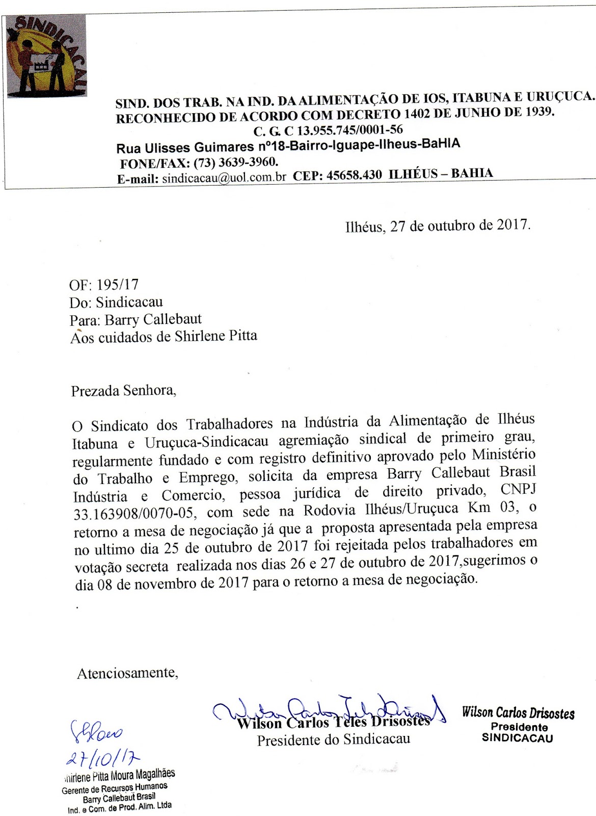 Ottobre 27, 2017 12:47, by SINDICACAU Foi realizada a Assembleia referente a Campanha Salarial 2017 com os trabalhadores da Barry Callebaut Ilhéus a maior empresa processadora de cacau do mundo, localizada no Distrito Industrial de Ilhéus Bahia