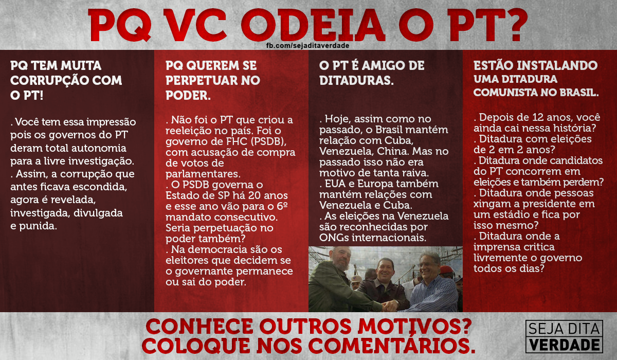 Assim como o lema na implantação do neoliberalismo, conforme relata Paulo Nogueira Batista em seu livro O Consenso de Washington, era que o que é estatal não presta e bom mesmo é o privado, hoje se tenta passar a mesma mensagem contra o PT e outros organismos representativos. Bom mesmo é o partido PSDB e seus aliados que inventaram o estado desenvolvimentista e a privatização e o que não presta é o PT, que segundo eles inventou a corrupção. Esse argumento está tirando alguns elementos do PT, que na verdade nunca honraram suas cores e muito menos suas bandeiras de luta.