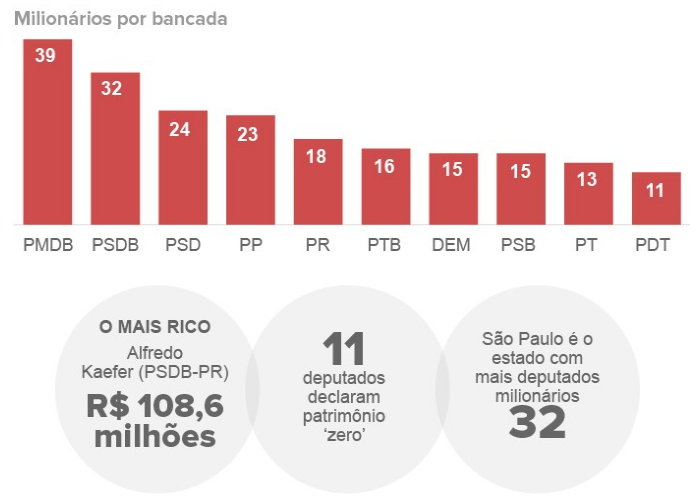 Ao vermos por Estado, o Estado de São Paulo puxa a fila com 32 deputados milionários, seguido por Minas com 26, Rio de Janeiro com 22, Bahia 20 e Pernambuco com 18. Não por acaso, São Paulo e Minas são os dois maiores colégios eleitorais do PSDB. A reportagem revela ainda que só o Estado do Amapá não terá deputado milionário eleito nessas eleições.